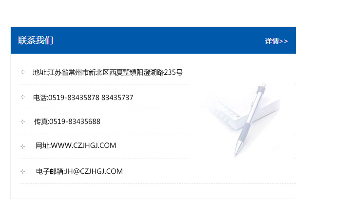 傳真:0519-83435688    郵編:213135    網址:WWW.czjhgj_com.xianshuangying.com    電子郵箱:JH@czjhgj_com.xianshuangying.com